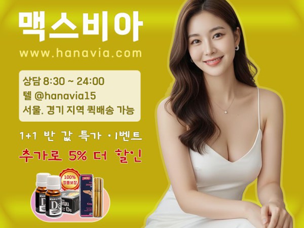현재 1+1 반 값 특가 이벤트 진행 중이며, 추가로 5% 할인과 사은품(칙칙이, 여성흥분제) 제공이 가능합니다. 서울·경기 지역은 퀵배송 가능, 평일 14:00~23:00, 주말 및 공휴일도 배송 가능합니다.